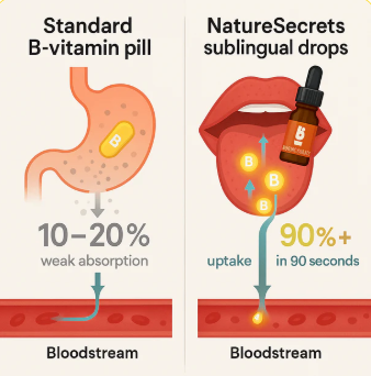 Most B-vitamin pills only deliver a tiny fraction of what your nerves need. Sublingual drops bypass the gut and absorb directly into the bloodstream, delivering 90%+ uptake in under 90 seconds — finally giving your body enough to repair