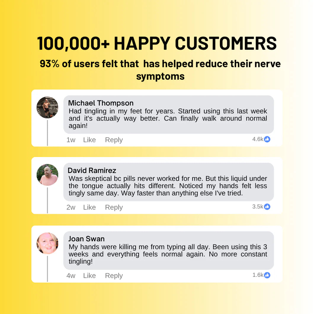 • I've had neuropathy for 6 years. Burning, tingling feet that kept me up every night. Tried everything: creams, pills, even B12 shots. Nothing lasted. After 3 weeks on these drops, the burning is 80% gone. I can sleep through the night again. Wish I'd found this years ago..